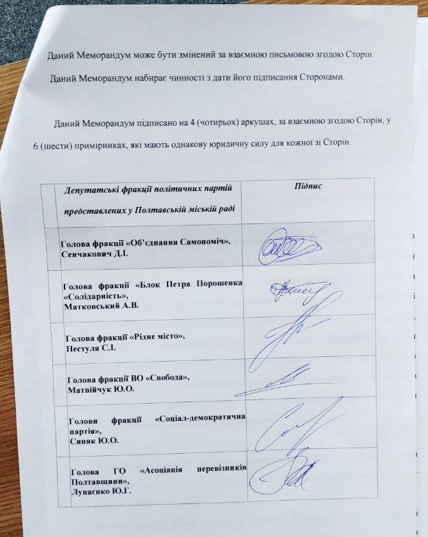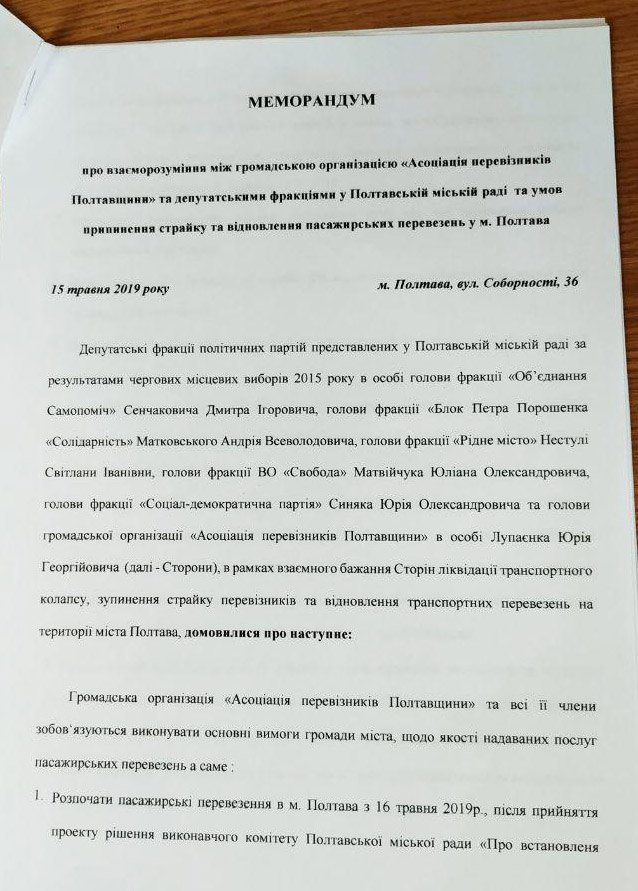 15 травня депутатська комісія зібралася знову. Перед голосуванням представник ГО «Асоціації перевізників Полтавщини» Юрій Лупаєнко підписав меморандум з головами шістьох фракції. Підписання меморандуму «подарувало» один голос, якого не вистачало для ухвалення рішення.