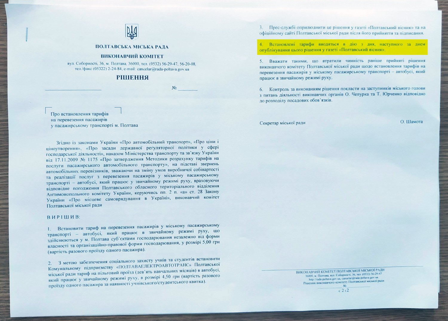 Після скликали виконком, на якому також проголосували за підвищення вартості проїзду. Згідно з рішенням виконавчого комітету Полтавської міськради, встановлені тарифи вводяться в дію з дня, наступного за днем публікації цього документа у газеті «Полтавський вісник». Тож завтра, 17 травня, полтавці мають платити нову ціну за проїзд.