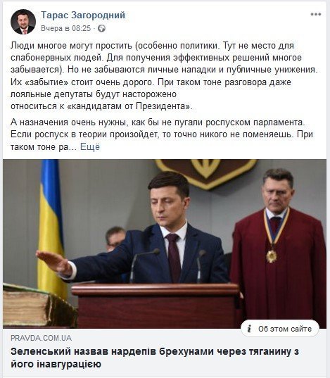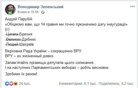После этого Владимир Зеленский на своей странице в Фейсбуке выложил ругательный пост, где написал, что слова спикера – «брехня дрібних шахраїв”.