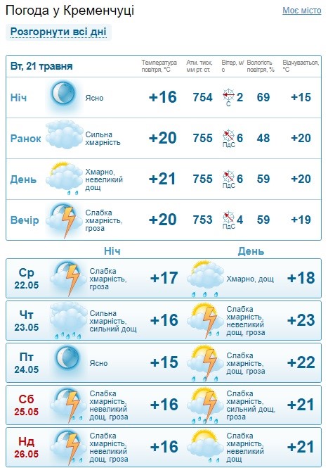 Gismeteo обіцяє, що у Кременчуці на цьому тижні не буде жодного дня без грозових дощів, починаючи з вівторка, 21 травня. Стовпчики термометрів показуватимуть від +15°С до +23°С. Середа стане найпрохолоднішим днем серед інших — максимально повітря прогріється до +19°С.