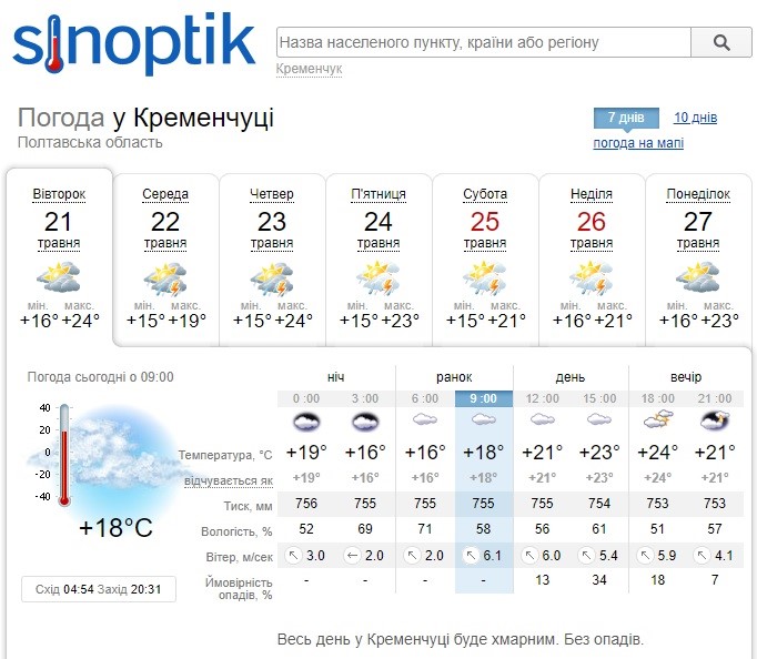 За даними Sinoptik, сьогодні, 21 травня, у Кременчуці буде хмарний день, проте без опадів. А вже з середи, 22 травня, протягом усього тижня чекаємо на грозові дощі та зливи, а от сонячних годин синоптики майже не передбачають. Температурні показники коливатимуться від +15°С до +24°С. Найпрохолодніше буде у середу, 22 травня, максимальна температура удень не перевищить +19°С.