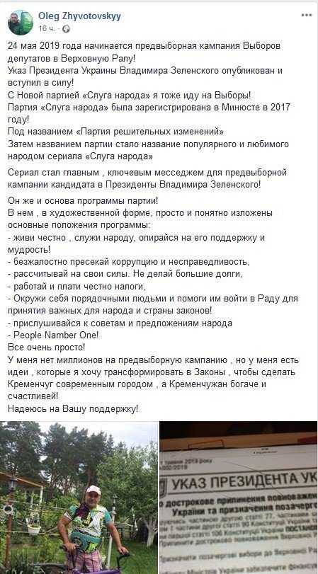 Кременчугский активист Олег Животовский заявил, что готов от имени партии «Слуга народа» участвовать в парламентских выборах. Заявление он разместил на своей странице в Фейсбуке.