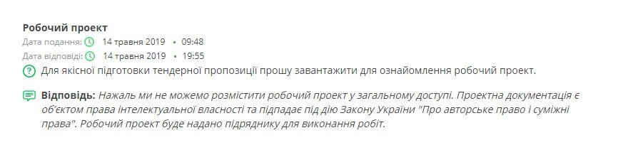 На цьому етапі потенційні учасники мають можливість ставити запитання до процедури. Один із них поцікавився робочим проектом реконструкції. Далі цитуємо листування з сайту публічних закупівель ProZorro.