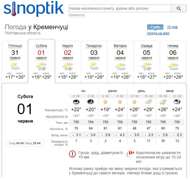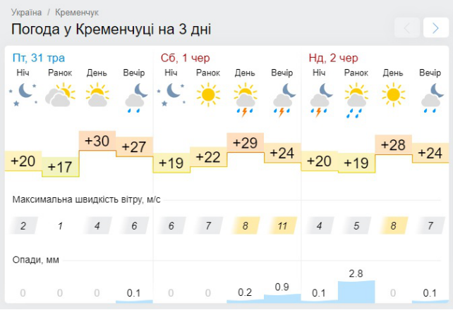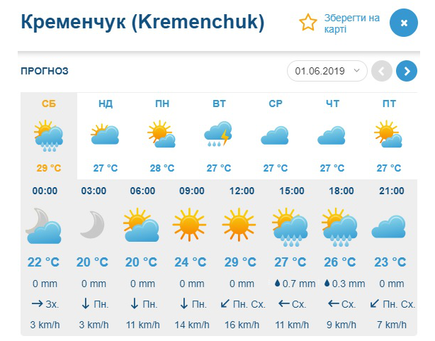 За даними Gismeteo, найнижча температура у вікенд буде +17°С, а найвижчі показники сягнуть «гарячої» позначки +30°С. Вечірні дощі з грозами можуть завадити прогулянкам кременчужан як в суботу, так і в неділю. Крім того, у неділю, 2 червня, гроза можлива й зранку.