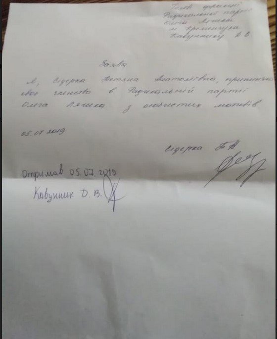 Она подала заявление о выходе из партии. Глава Кременчугской городской парторганизации Дмитрий Кавунник его подписал.