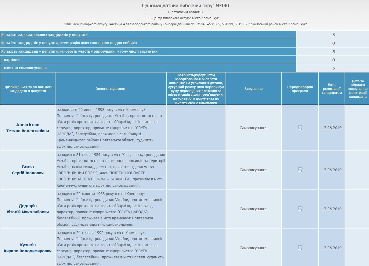 Кандидат Виталий Дедюрин – директор ПП «Слуга народа», дата регистрации предприятия – 06.06.2019 г. Дата рождения директора предприятия – 20.10.1968 г. Образование высшее. Предыдущее место работы – директор кременчугского коммунального предприятия «Городской сад». Уволился и подался в кандидаты.