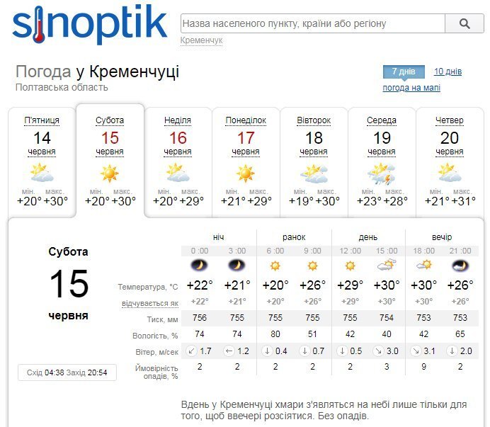 За даними Sinoptik, триденний вікенд відзначиться ясною та спекотною погодою, пройде без опадів. У неділю, 16 червня, хмари затягнуть небо майже на весь день, що дозволить трохи перепочити від гарячих сонячних променів. Стовпчики термометрів показуватимуть від +20°С до +30°С.