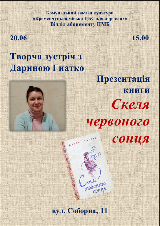 Що: Творча зустріч з Дариною Гнатко. Презентація книги «Скеля червоного сонця».