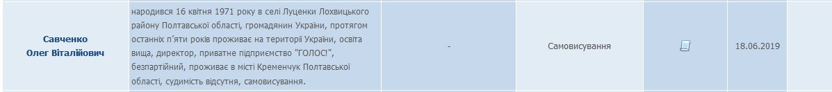 Он идет на выборы как самовыдвиженец и беспартийный. При этом он зарегистрировался как директор приватного предприятия, чье название идентично названию популярной политической партии. Предприятие Савченко называется «Голос!», а партия Святослава Вакарчука называется «Голос».