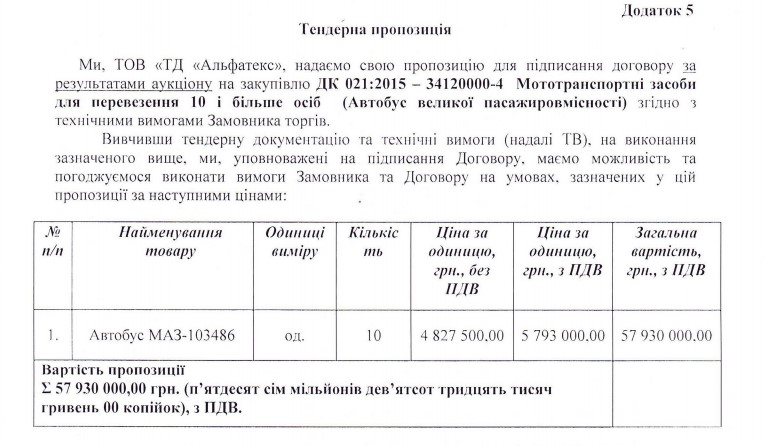 Ожидаемая цена на 10 12-метровых автобусов была заявлена в 65 млн 270 тыс грн. К торгам допустили известное в Кременчуге ООО «ТД «Альфатекс», а также ООО «БАС МОТОР». В тендере хотело участвовать ООО «Совместное украинско-немецкое предприятие «Электротранс», но его не допустили к участию из-за отсутствия наименования предлагаемого товара в проекте договора.