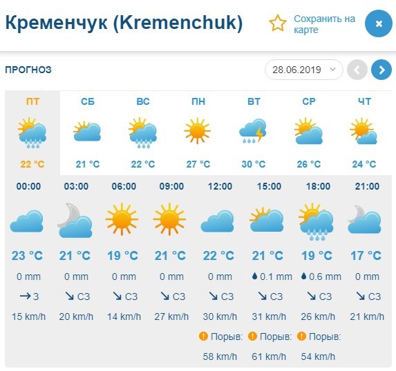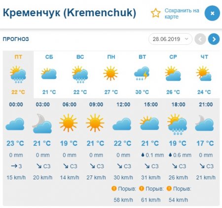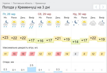 А от Ventusky прогнозує дощі у другій половині дня у п'ятницю, 28 червня, близько 18.00 та у неділю, 30 червня, близько 15.00. Крім того, після обіду у п'ятницю погодний портал попереджає про сильні пориви вітру — до 61 км/год. У суботу, 29 червня, небо увесь день буде затягнуте хмарами, сонячних годин практично не передбачається, проте без опадів. Стовпчики термометрів показуватимуть від +16°С до +23°С, а у неділю, 30 червня, у ранкові години температура знизиться до +13°С.