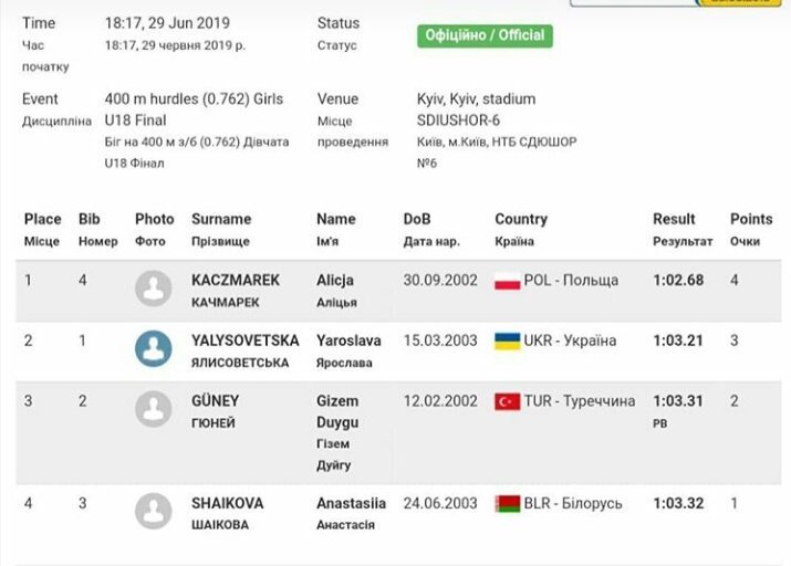 Кременчужанка Ярослава Ялисоветська, у складі збірної України, змагалася у бігу на 400 м з бар’єрами. Ярослава фінішувала другою з часом 1:03,21. Першою фнішувала полячка Аліцья Качмарек (час 1:02,68).
