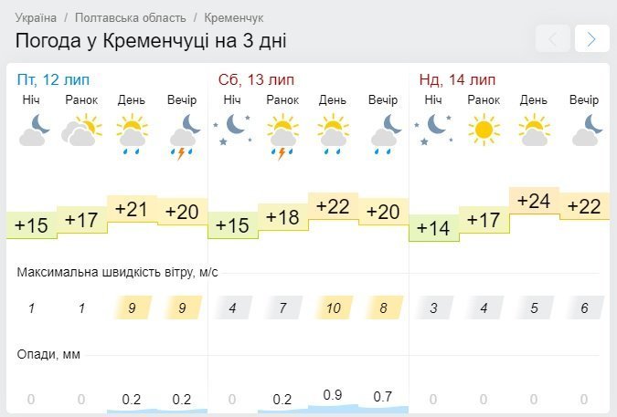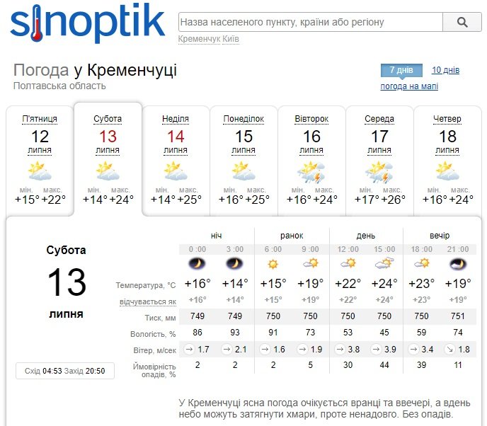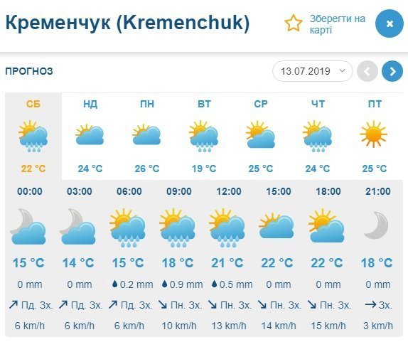 А от Gismeteo навіть прогнозує грозу у суботу, 13 липня, та невеликий дощ протягом усього дня. Неділя, 14 липня, пройде без опадів та порадує кременчужан сонячним ранком. Стовпчики термометрів показуватимуть від +14°С до +24°С.