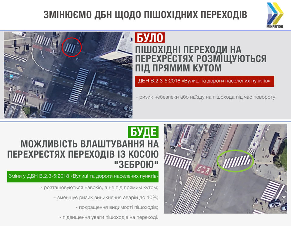Згідно із запропонованою зміною в ДБН, влаштування пішохідних переходів навскіс можливе за умови, що кут розташування «зебри» стосовно тротуару буде не більше 70 градусів.