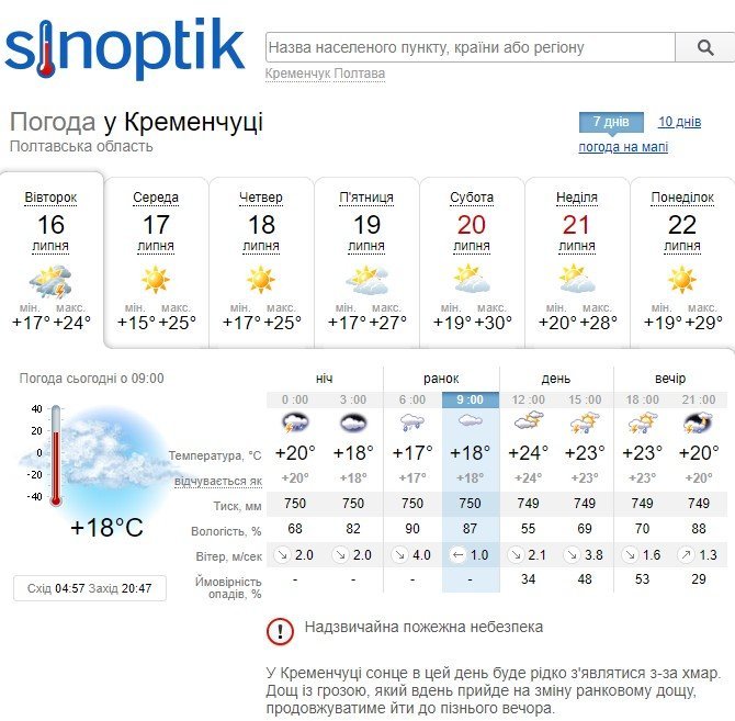 Сьогодні, 16 липня, у Кременчуці можлива гроза. За прогнозами УкрГідрометцентру, 16 липня, грози пройдуть на всій на території Полтавської області.
