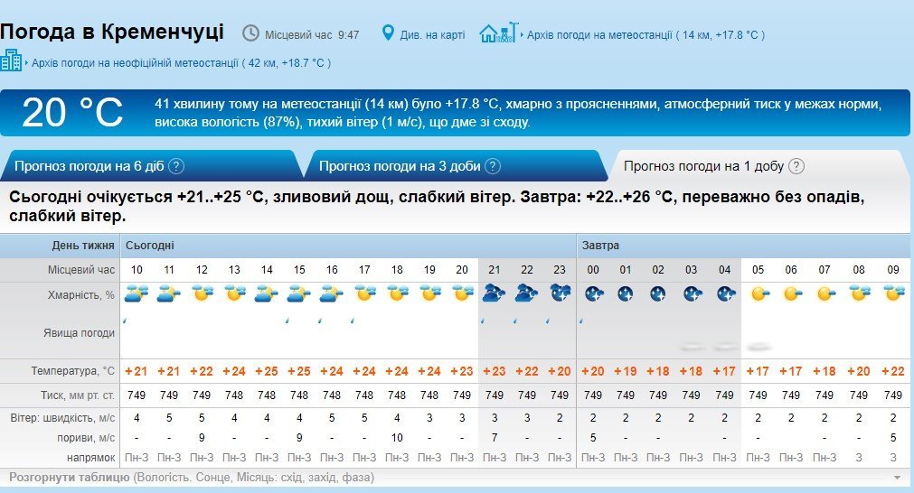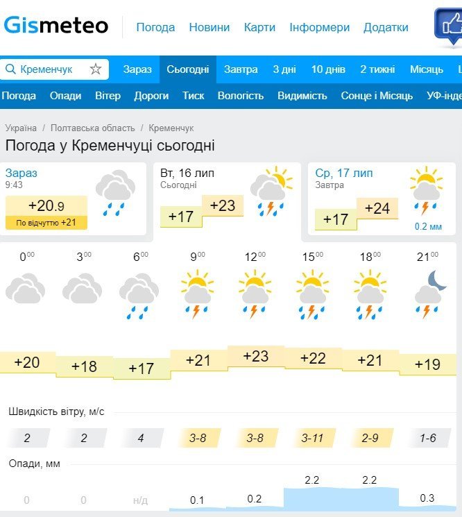 На Rp5 грози кременчужанам не обіцяють, але прогнозують зливу післяобід і вночі та пориви вітру до 10 м/с.