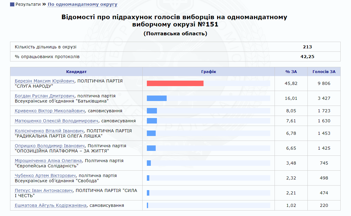 За даними ЦВК оброблено 45,82% або 9 806 виборців.