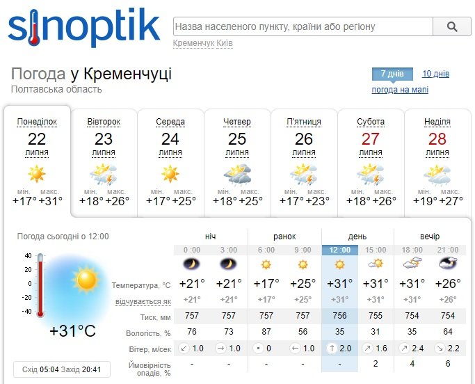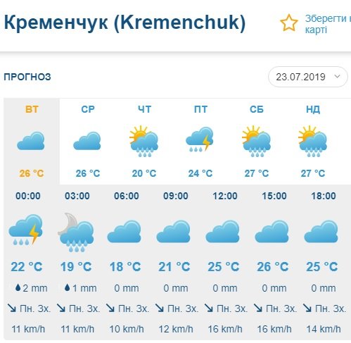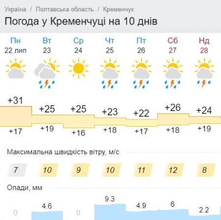 Згідно прогнозу Sinoptik, температура впродовж тижня коливатиметься від +17°С до +26°С. Найтеплішим днем стане неділя, 28 липня, а найхолоднішим — п'ятниця, 26 липня. Майже кожного дня кременчужанам слід чекати дощів, велика ймовірність і гроз. Лише середа, 24 липня, виявиться напрочуд сонячною, без натяку на опади.