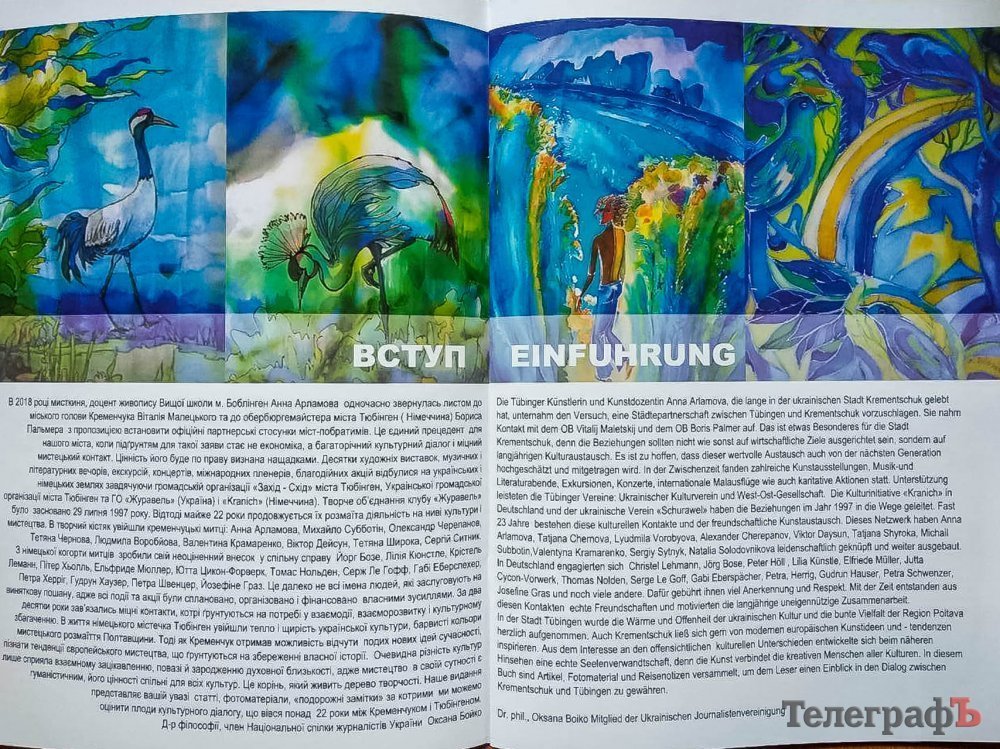 Цього літа до Тюбінгена «літали» зі своїми картинами Кременчуцькі «журавлі» Оксана Бойко і Олександр Черепанов. Окрім художніх творів, вони презентували німецькій громадськості альбом «Кременчук-Тюбінген. 22 роки культурного діалогу», авторами якого стали члени творчого об’єднання «Журавлі» з обох сторін. Альбом – своєрідний звіт діяльності творчої спільноти за десятиліття. Зокрема, влада виділила кошти з міського бюджету на видання цього альбому. У вступному слові до видання мер Віталій Малецький висловив зацікавленість у зміцненні відносин між Кременчуком та Тюбінгеном.