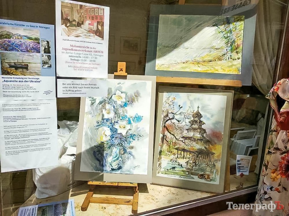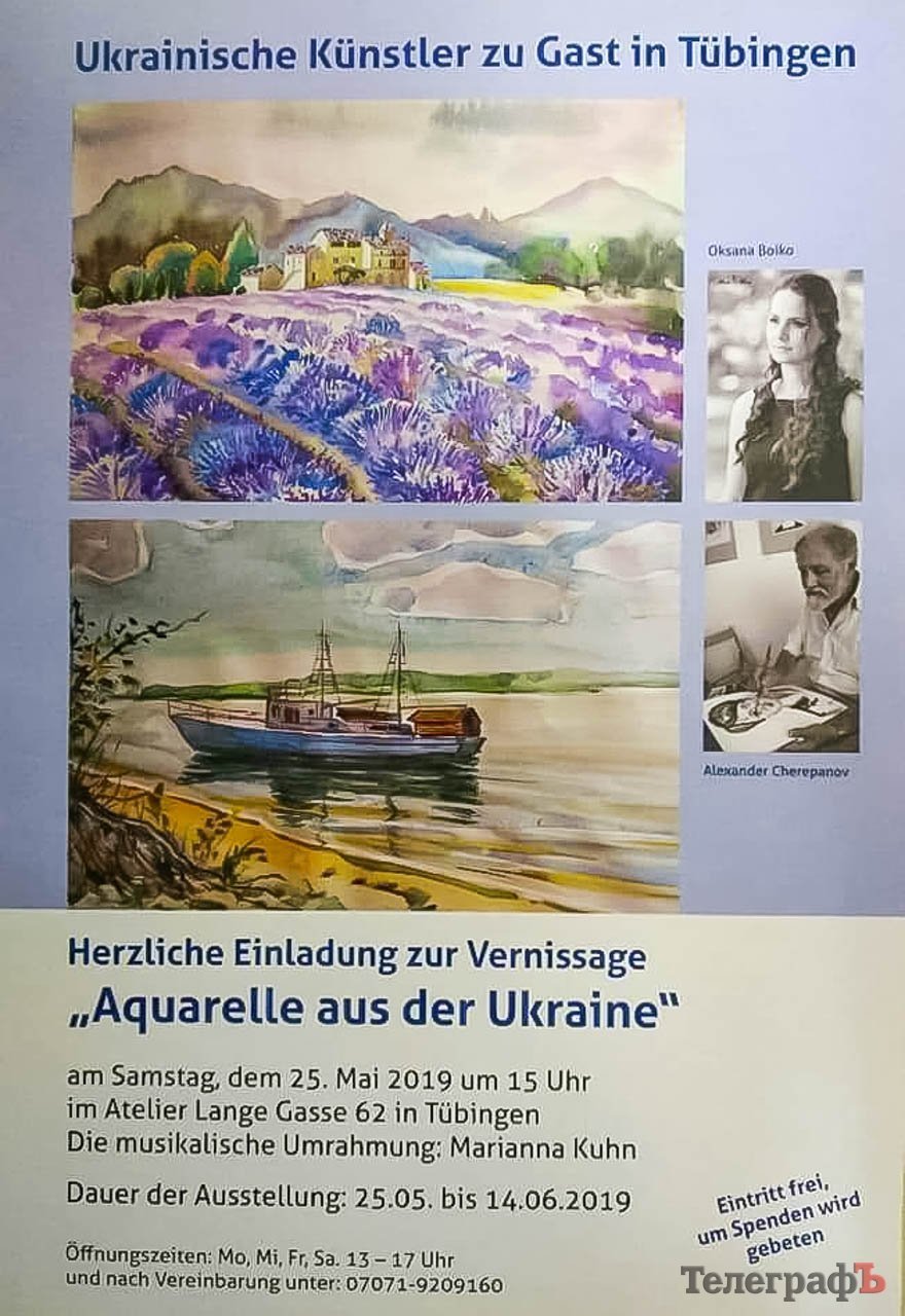 «Акварелі з України» – під такою назвою пройшла нещодавно виставка картин кременчуцьких художників Оксани Бойко і Олександра Черепанова у німецькому місті Тюбінген. У художній галереї «Atelier Lange Gasse 62» наші митці представили понад ста робіт із краєвидами Дніпра, сучасного та історичного Кременчука, чудовими пейзажами з його мальовничих околиць, а також – морські етюди та цикл робіт «Дорогами Європи».