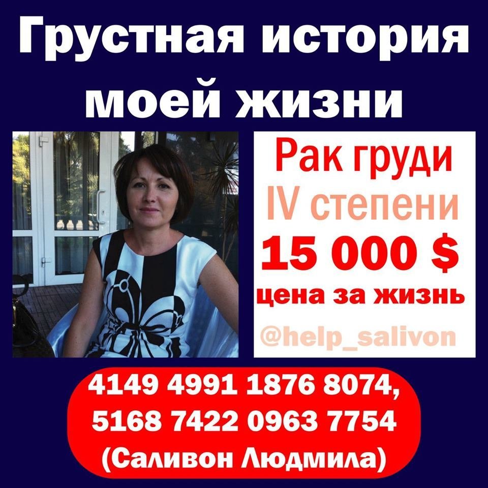 «Сумна історія мого життя» – цими словами кременчужанка Людмила Саливон розпочала пост у фейсбуці про річну боротьбу з раком. 31 липня, минув рік з моменту, коли вона дізналася, що хвора на рак. Лікарі поставили діагноз – рак молочної залози (обох молочних залоз). Зараз у жінки констатували метастази в організмі (в хребті, і в голові).