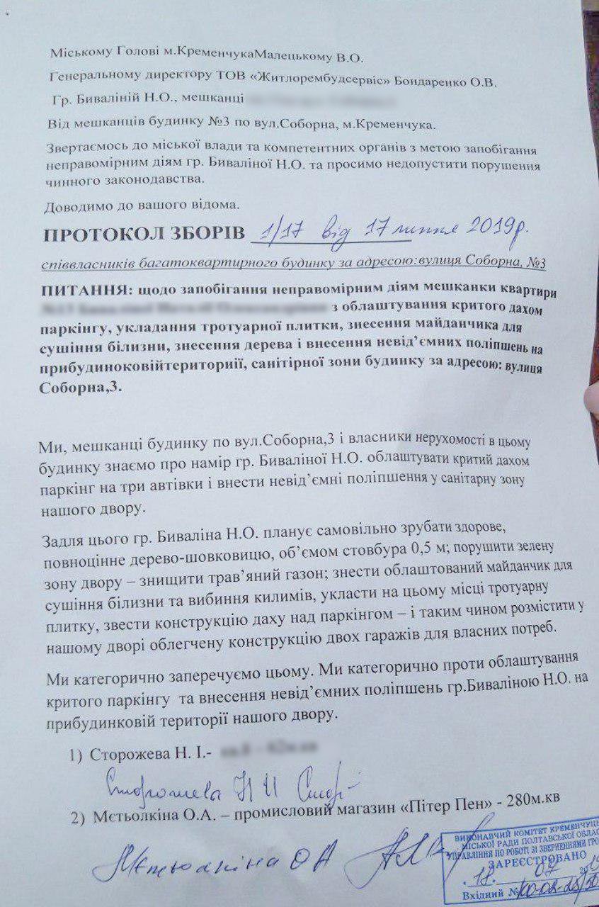1 серпня до редакції «Телеграфа» звернулася кременчужанка Олена, мешканка будинку на вулиці Соборній, 3. Вона розповіла, що її сусіди незаконно знищили зелені насадження у дворі та будують посеред спільного двору криту парковку.