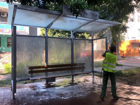 Напередодні Дня Незалежності України працівники комунального підприємства «Благоустрій Кременчука» проводять вологе прибирання зупинок громадського транспорту у місті.
