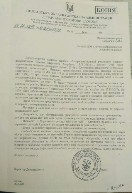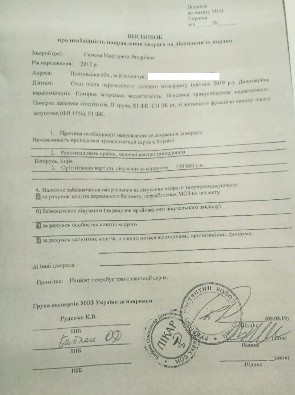 У висновку про необхідність направлення на лікування за кордон лікарі вказали - неможливість проведення трансплантації серця в Україні. Один з двох варіантів Білорусь або Індію, родина зупинилася на варіанті Білорусь, оскільки це територіально ближче й легше знайти вихід на лікарів.