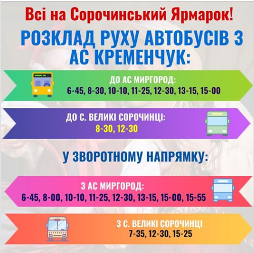 Варто зауважити, що квиток на автобус з Кременчука до Великих Сорочинців коштує 145 грн, а до Миргорода – 120 грн. Додаткових автобусів – не обіцяють.