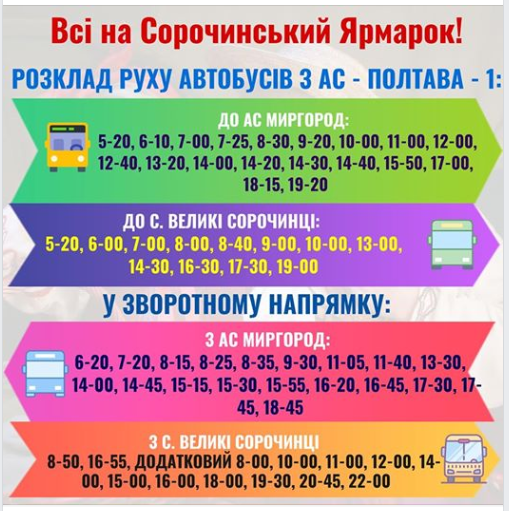 До речі, з Миргорода у дні проведення Сорочинського ярмарку транспортне сполучення буде регулярне. Пропонуємо до уваги розклад за цими напрямками.