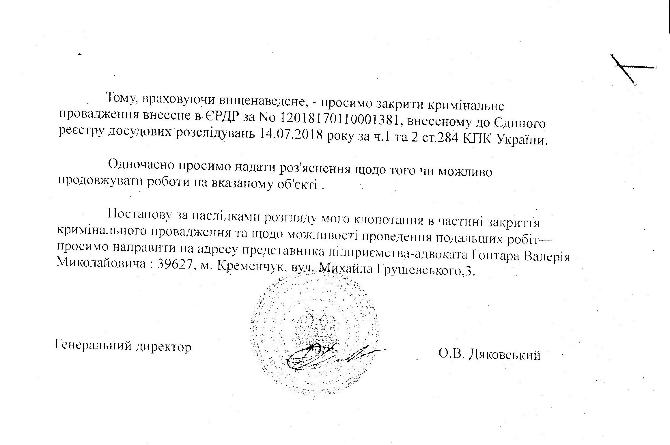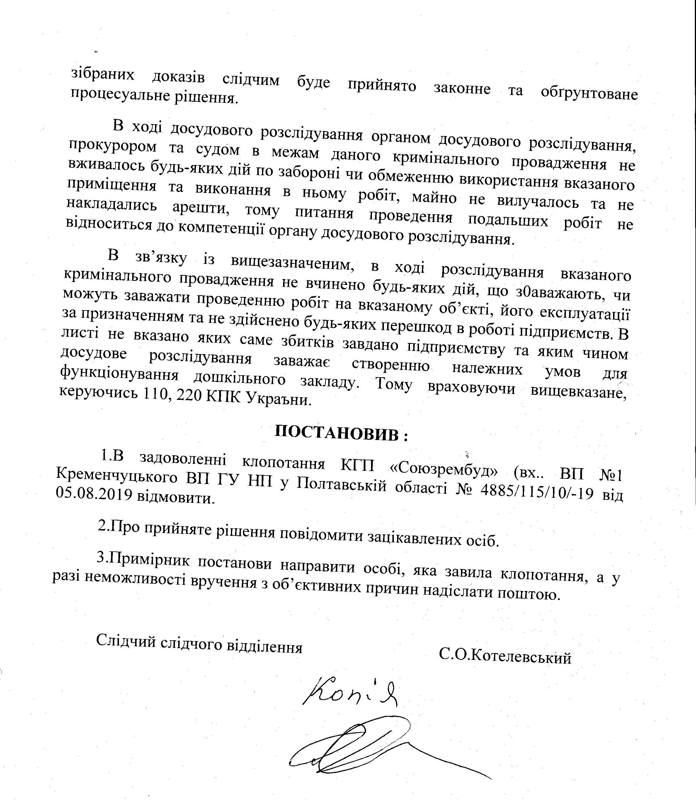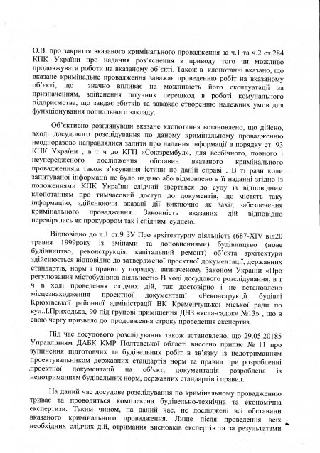 На лист Олександра Дяковського надійшла відповідь від слідчого Котелевського С.О. про відмову в задоволенні клопотання. У листі зазначено, що слідство триває, а роботи зупинені «у зв'язку із недотриманням проєктувальником державних стандартів, норм та правил при розробленні проєктної документації на об'єкт». Олександр Дяковський пояснює, що претензії до проєктувальників пов'язані із тим, що законодавство забороняло розміщувати дитячі заклади в адмінбудівлях — свого часу про це писали кременчуцькі ЗМІ. Він підкреслює, що це — претензії до проєктувальників, але не до будівельників.