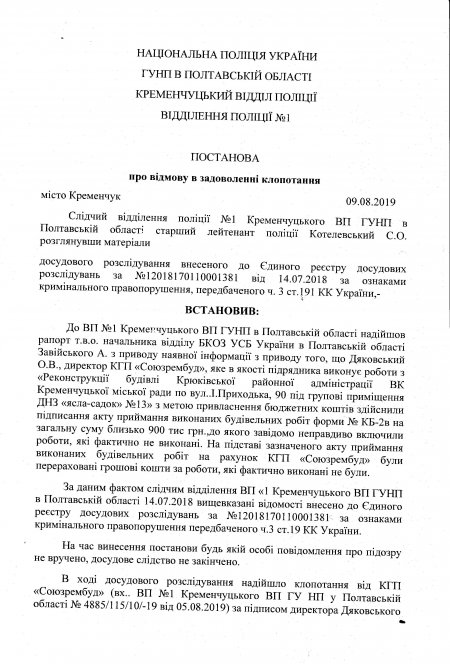 30 липня керівник КГП «Союзрембуд» Олександр Дяковський подав клопотання слідчому поліції про закриття кримінального провадження. У своєму листі він зазначив, що слідство триває понад рік, жодній особі не оголошено підозру; немає доказів того, що до актів виконаних робіт були включені роботи, які фактично не виконувалися.