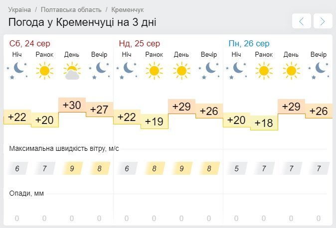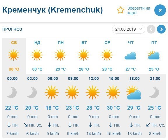 За прогнозами Ventusky, усі три вихідні радуватимуть мешканців Кременчука сонячною погодою, лише у суботу, 24 серпня, надвечір можлива мінлива хмарність. Дощі не заважатимуть містянам відпочивати, а температурні показники коливатимуться у межах +17-30°С. У понеділок, 26 серпня, зранку можливе зниження температури до +15°С.