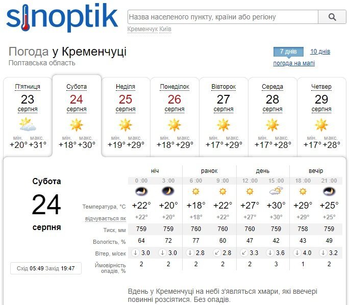 Завдячуючи святкуванню Дня Незалежності України, кременчужани на цьому тижні матимуть триденні вихідні та відпочиватимуть 24-26 серпня, з суботи до понеділка. Якої ж погоди їм чекати у святковий вікенд? Погодні портали усі як один обіцяють сонячні дні та відсутність дощів, тож можна сміливо вирушати на відпочинок на природі або на березі водойми.