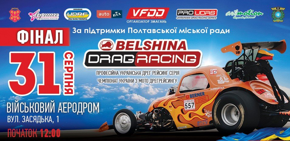 30 и 31 августа на военном аэродроме в Полтаве будет шумно и горячо. Здесь проходят заезды гранд финала профессиональной украинской Дрэг Рейсинг* серии PROUDRS- BELSHINA DRAGRACING PRO COMPETITION of UKRAINE, Чемпионат Украины по мото Дрэг Рейсингу, финал Лиги развития Дрэг-рейсинга DDL и этап Чемпионата Союза клубов Украинской федерации дрэг-рейсинга UDRF.
