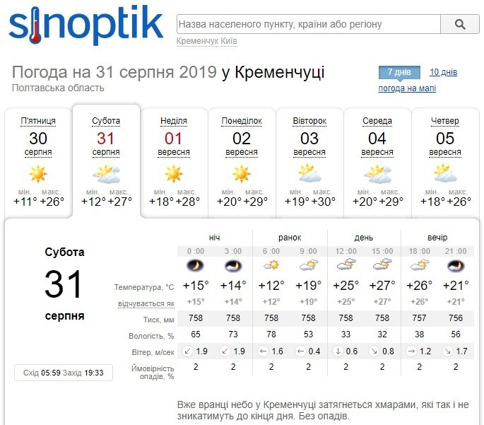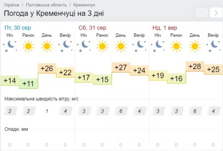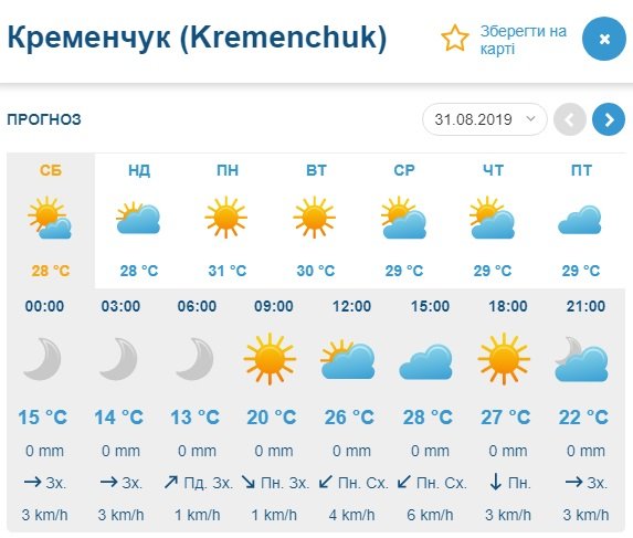 Gismeteo обіцяє ясну погоду протягом усього вікенду — як вдень, так і вночі. Зрозуміло, що дощі не потурбують кременчужан. Термометри покажуть від +15°С до +28°С. А от у вранішні години суботи, 31 серпня, можна буде навіть змерзнути, адже температура може впасти до +11°С. Тож вранці одягайтеся тепліше.