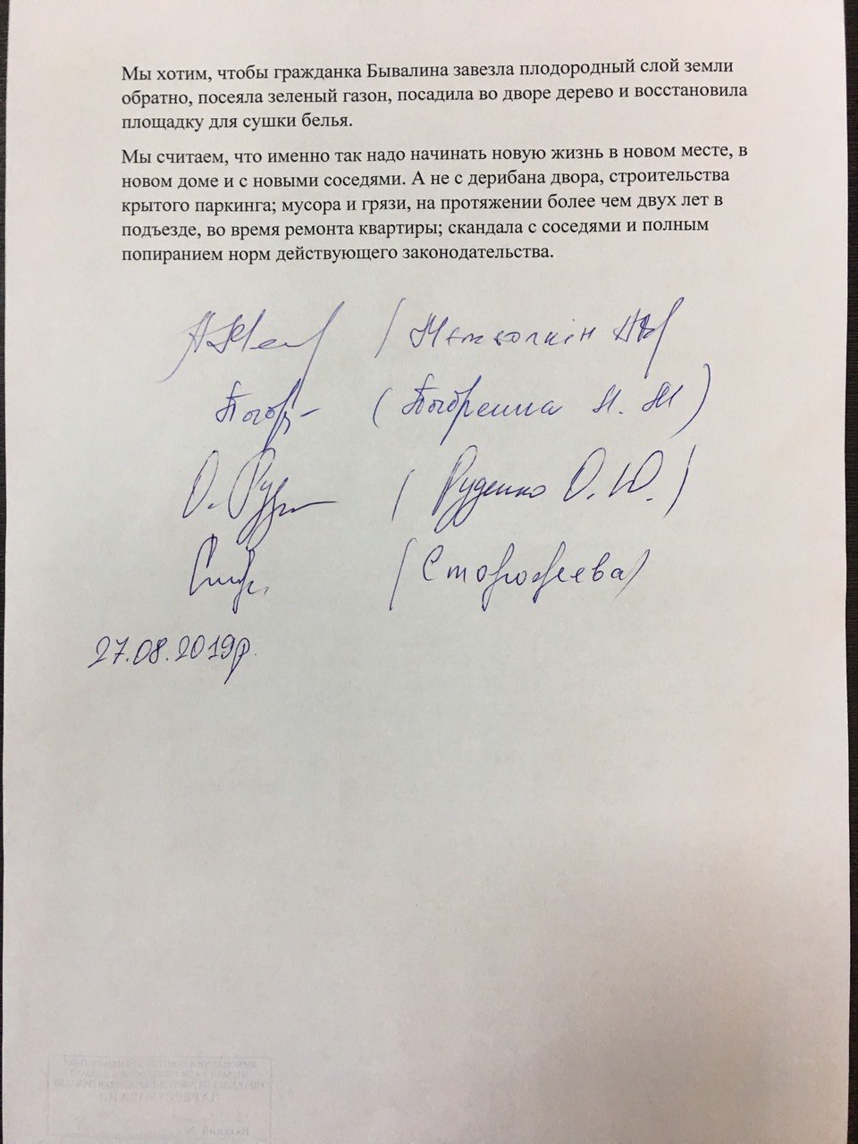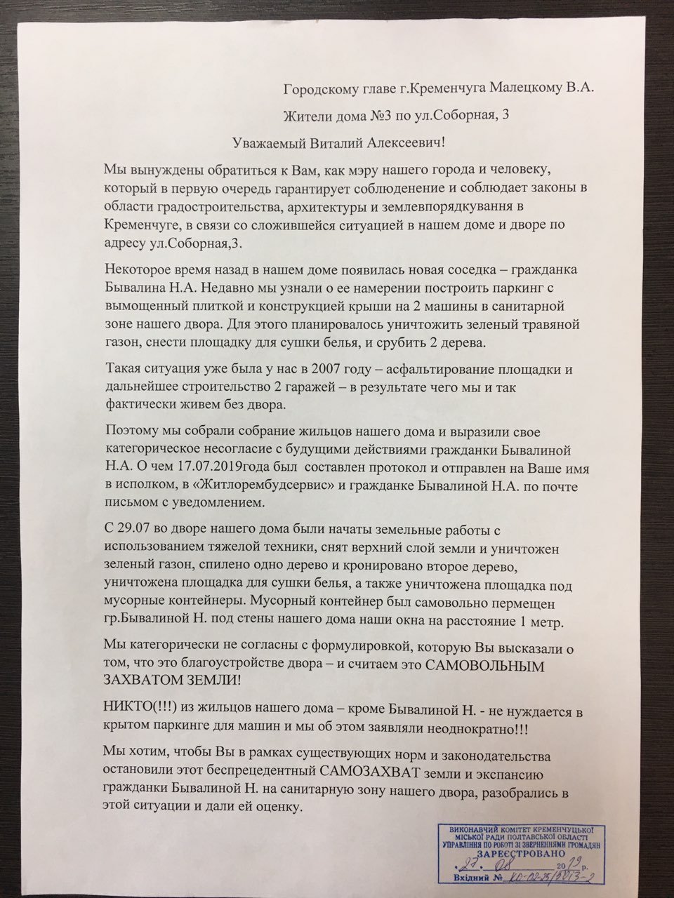 Жителі будинку на Соборній, 3 створили та підписали новий лист до мерії, в якому вимагають від сусідів-забудовників повернути двір у той стан, у якому він був на початку: висадити зелені насадження та встановити майданчик, де можна буде сушити білизну.