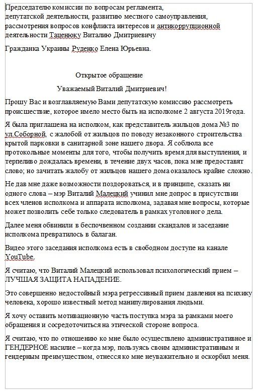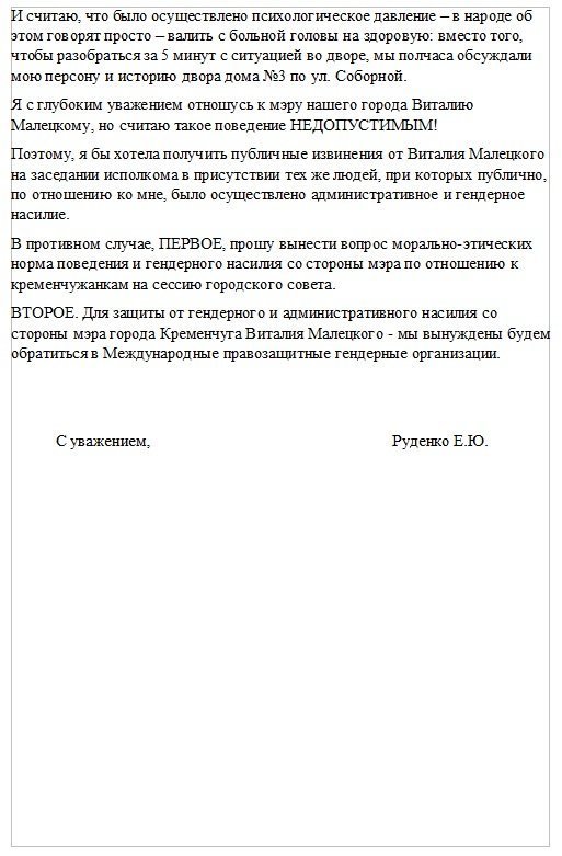 Тому жінка написала на нього скаргу, її текст вона надала редакції. У ній йдеться про те, що на засіданні мер Малецький вийшов за рамки ділового спілкування — перебивав та ображав Олену, а тому має публічно вибачитися перед кременчужанкою. В іншому випадку вона звернеться до міжнародних гендарних організацій, аби вони захистили її права.