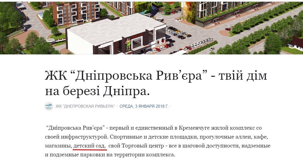 Будівництво комплексу з видом на Дніпро веде ПП «Дніпровська Рив’єра». Забудовник позиціонує його як єдиний у Кременчуці комплекс з власною інфраструктурою, дитячими та спортивними майданчиками, парковками, торговельним центром і (до речі) дитсадком – принаймні така інформація розміщена у на сторінці «Рив’єри» у Фейсбук.