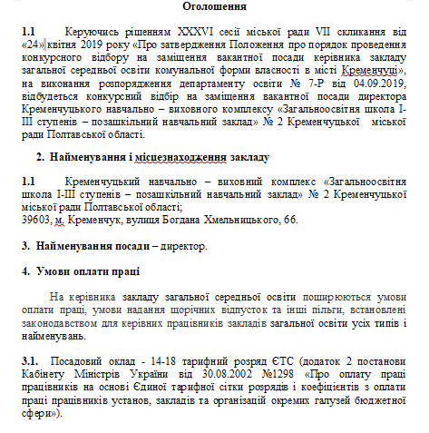 Оголошений конкурс відбору на заміщення вакантної посади директора Кременчуцького навчально-виховного комплексу «Загальноосвітня школа І-ІІІ ступенів – позашкільний навчальний заклад» № 2 Кременчуцької міської ради Полтавської області. Відповідне розпорядження опубліковано на сайті Департаменту освіти Кременчука.
