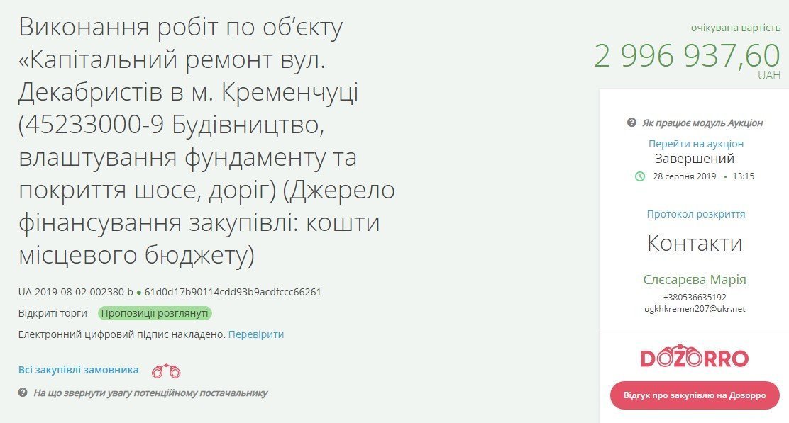 Нижчу ціну запропонувала ПП «Перша українська будівельна компанія» – 2 млн 850 тис грн (проти очікуваної ціни, яку вказав замовник 2 млн 996,9 тис грн). Проте після розкриття пропозицій учасників тендерний комітет ДЖКГ визнав, що пропозиція ПП «Перша українська будівельна компанія» не відповідає умовам тендерної документації.