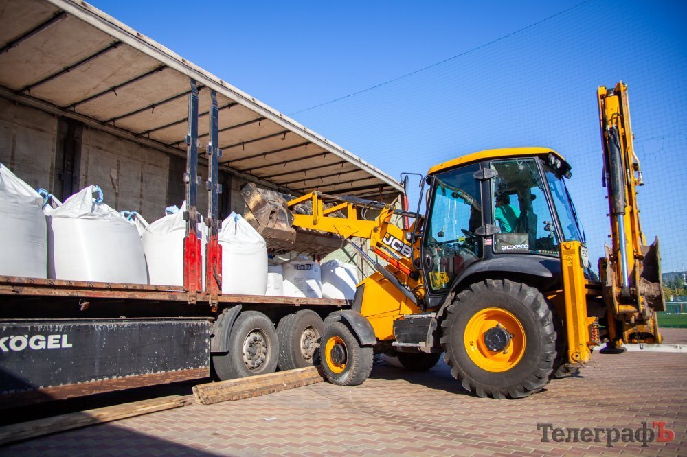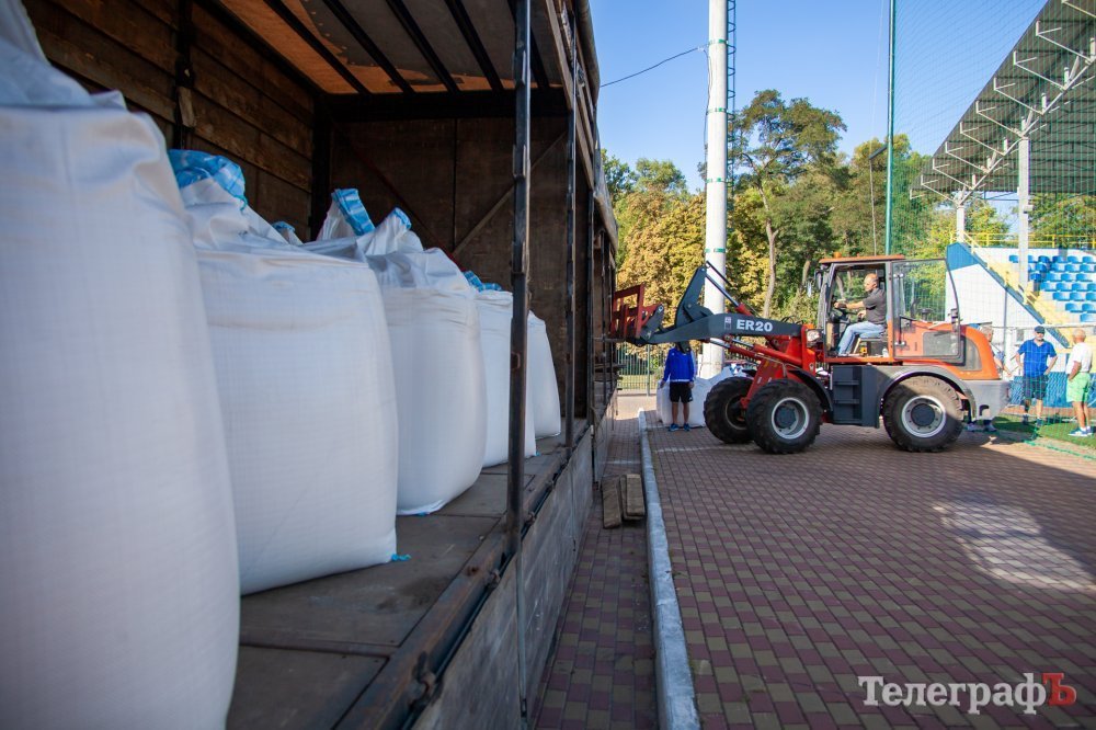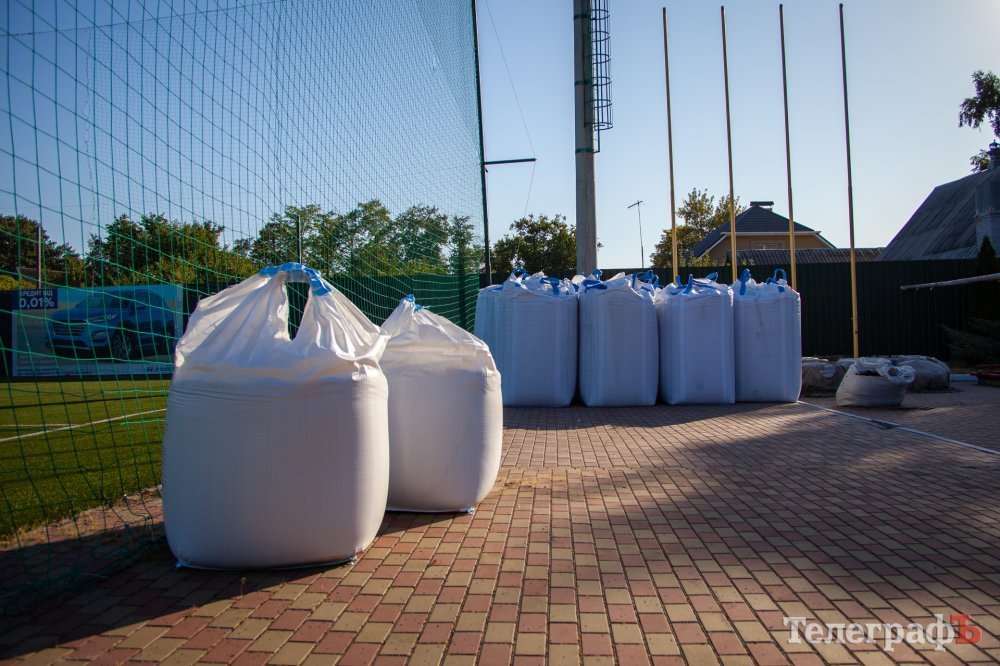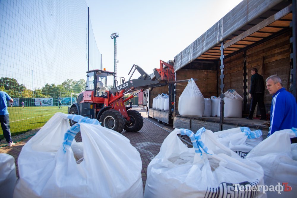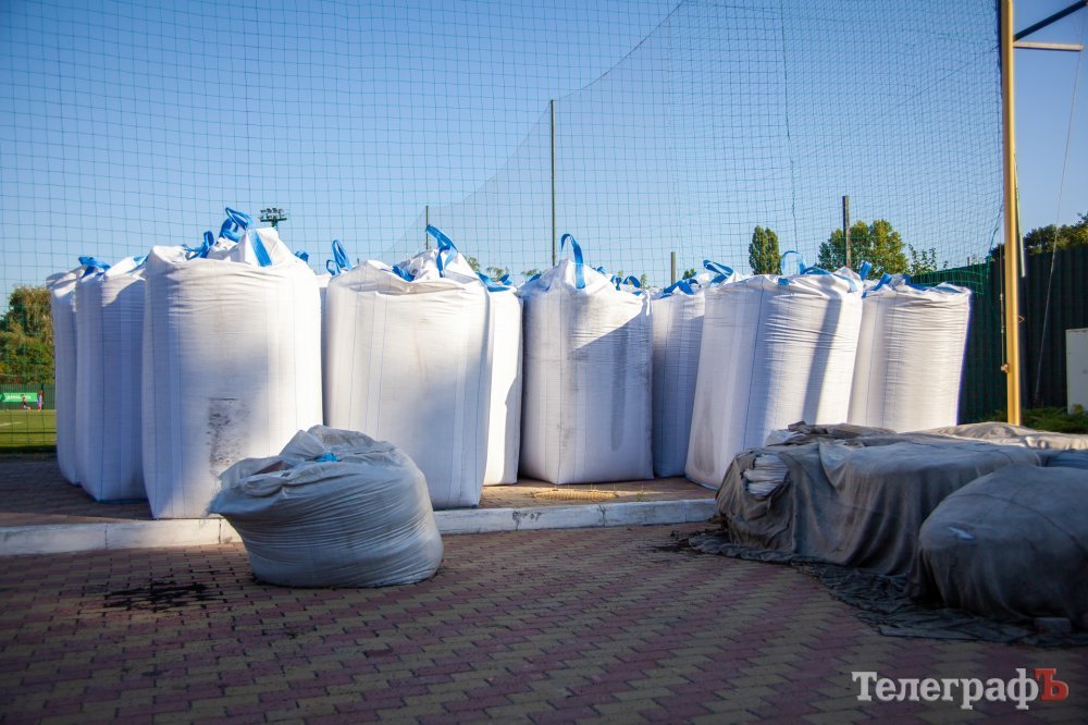 На домашній арені футбольного клубу «Кремінь» – «Кремінь-Арена» розпочалися попередні підготування до заміни штучного покриття. Вчора ввечері, 9 вересня, до Кременчука заїхали дві величезні фури з піском та гумовою крошкою. Весь ранок з автомобілів вивантажували мішки. Один такий мішок з піском важить – одну тонну (1000 кг).