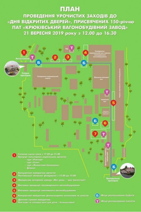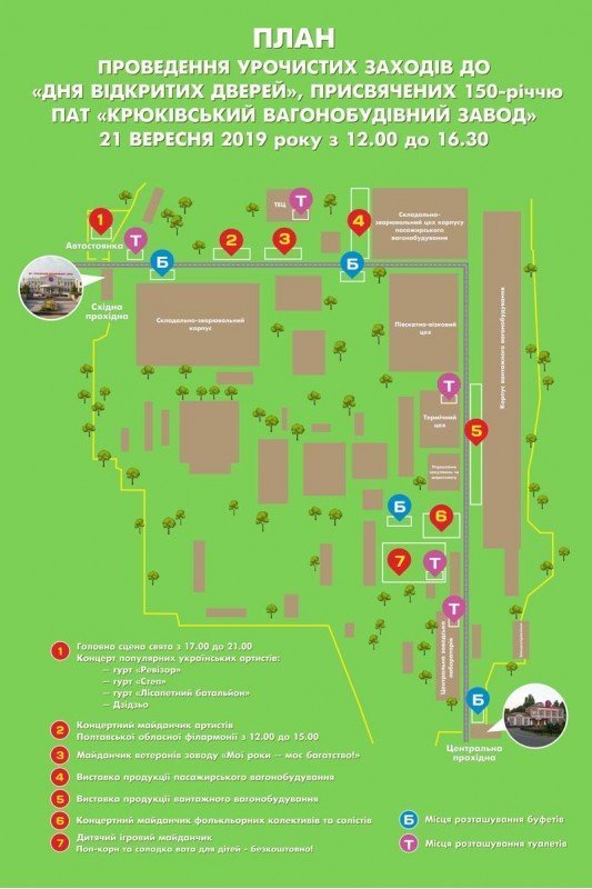 О 12.00 для вагонобудівників і гостей відкриються заводські ворота. Вхід вільний. Запрошуємо кременчужан і гостей міста познайомитися з заводом, його досягненнями та продукцією. Діти – тільки у супроводі дорослих.