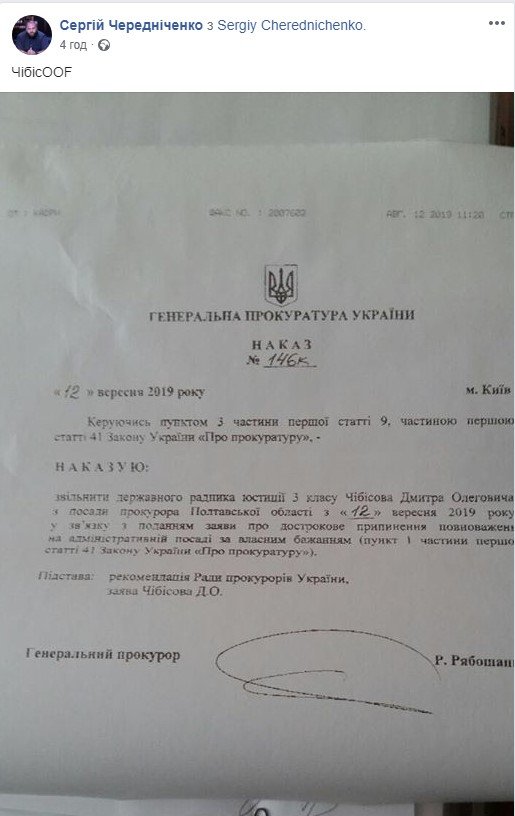 На фейсбук-сторінці екс-депутата Полтавської міськради Сергія Чередніченка розміщене фото наказу, яким Дмитра Чібісова нібито звільнено з посади. У наказі йдеться, що прокурора звільняють у зв'язку з поданням заяви про дострокове припинення повноважень на адміністративній посаді за власним бажанням.