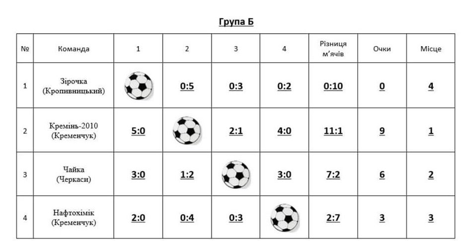 Команди провели хороші захоплюючі ігри. Переможцями турніру стали вихованці Олександра Назаренка та Анатолія Безуса «Кремінь» 2010 р.н. Друге місце посіла команда зі Світловодська - «Спарта», а третє у футбольного клубу «Чайка» Черкаси.