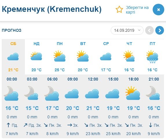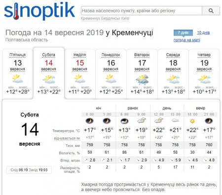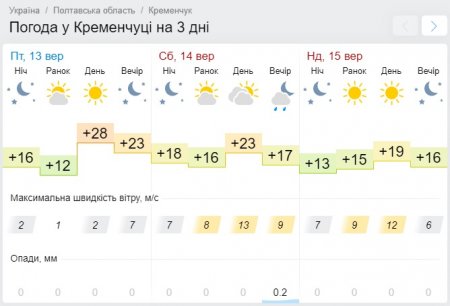 А от Gismeteo прогнозує у суботу, 14 вересня, мінливу хмарність та вечірній дощ. У неділю, 15 вересня, за інформацією цього погодного порталу, на кременчужан чекатиме сонячна погода. Температура коливатиметься від +13°С до +23°С.