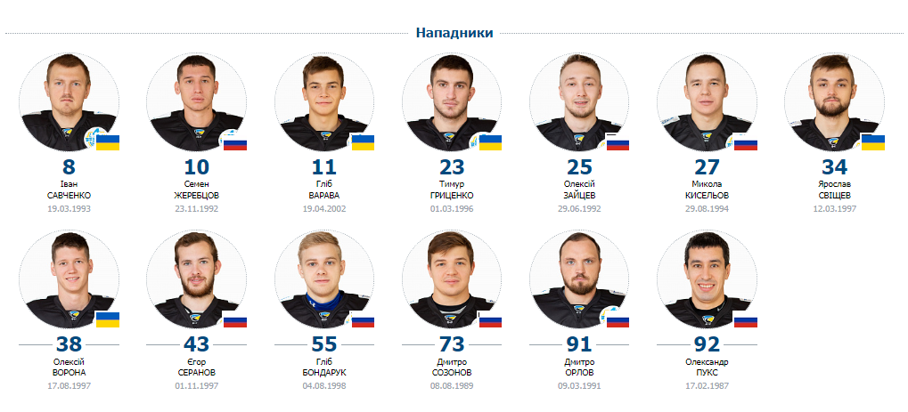 Нападники: Іван Савченко, Тимур Гриценко, Олексій Ворона, Микола Кисельов (Росія), Олексій Зайцев (Росія), Єгор Серанов (Росія), Дмитро Созонов (Росія), Олександр Пукс (Росія), Дмитро Орлов (Росія), Семен Жеребцов (Росія), Ярослав Свищев, Гліб Бондарук (Росія), Гліб Варава.