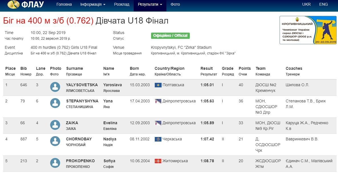 22 вересня в Кропивницькому завершився чемпіонат України серед ДЮСШ та СДЮШОР серед атлетів 2002 р.н. та молодших. Участь у змаганнях взяла кременчужанка Ярослава Ялисоветська, легкоатлетка, яка є вихованкою Олени Шипової. Спортсменка з КДЮСШ №2 виступила да дистанції 400 метрів з бар’єрами.