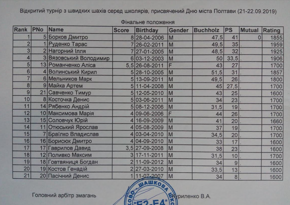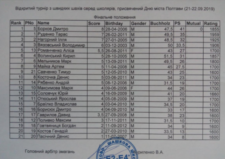 21-22 вересня у відкритому цього літа в Полтаві шаховому клубі «Е2-Е4» відбувся шаховий турнір серед школярів зі швидких шахів, присвячений Дню міста. Як повідомив «Телеграфу» директор шахово-шашкового клубу «Каїсса» Володимир Груздєв, до солідної компанії з 18 полтавців на чолі з чемпіонами області до 14 років Дмитром Борковим і до 8 років Тарасом Руденко приєдналися і троє юних кременчужан: Аліса Романченко і Максим Поливко з «Каїсси», а також Марк Мельников.