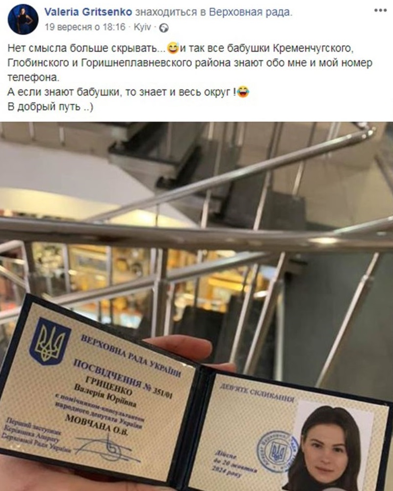Народный депутат Алексей Мовчан взял себе в помощники дочь секретаря Кременчугского горсовета Юрия Гриценко Валерию. Об этом помощница нардепа сама сообщила у себя на странице в Facebook, но позже публикация была скрыта: